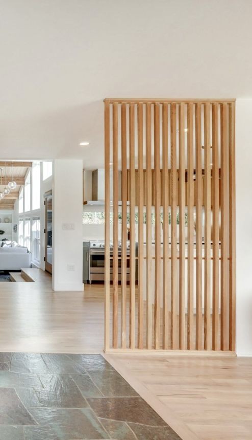 در مورد بعد می توان پارتیشن چوبی برای تقسیم بندی اتاق های پذیرایی و نشیمن استفاده کرد.